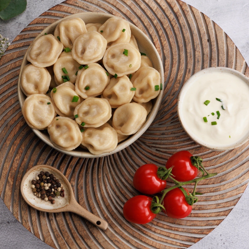 Pelmeni, liebevoll „Pelmjaschi“ genannt, kann man jeden Tag genießen. Diese köstlichen Pelmeni sind klein, mundgerecht und einfach nur saftig. Die schmackhaften Pelmjaschi aus bissfestem Nudelteig, gefüllt mit einer leckeren Fleischfüllung, platzen beim ersten Biss auf, und der köstliche Saft im Inneren macht diese Pelmeni zu einem unvergesslichen Genuss, Tag für Tag, Stück für Stück. Unsere Pelmeni mit Hähnchenfleisch sind mit frischem Knoblauch verfeinert.